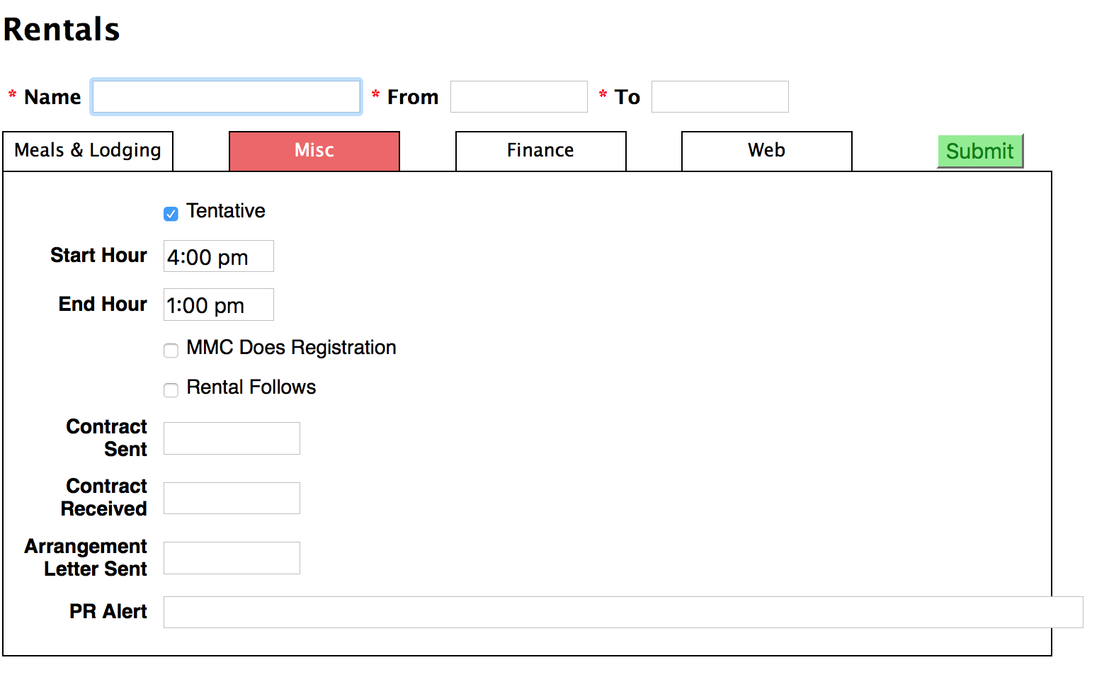 In the discussion at the Program Meeting you probably settled on a date range that would work for this Proposal. Fill in the start and end date of the Rental and hit Submit. A rental is thus created.