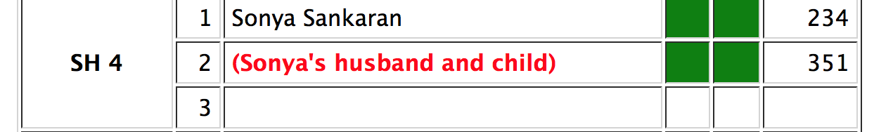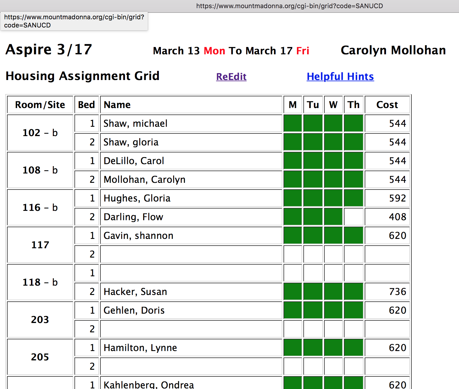 The Web Grid calculates a cost for each person and displays it in the grid after the entries are submitted. The cost depends on how many other people are in the room - and, of course, on the housing cost (which is displayed at the bottom of the grid). As an example, say person A in a Double room has a roommate (person B) for the first night. They will both pay the Double rate for that night. If person B leaves the next day, person A will pay the Single rate for the rest of the rental.