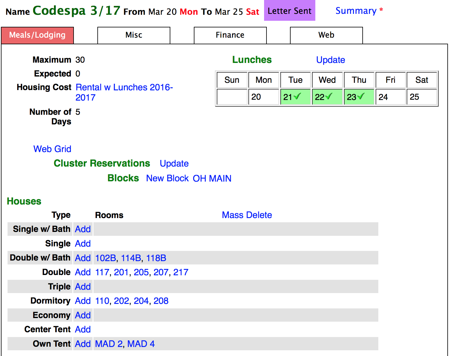 When you have added/deleted all needed houses you click on the phrase 'Send to Web' (in red color next to the link 'Web Grid' on the Meals/Lodging tab). This sends the information to the global web where it is visible to the rental Contact Person. After you click on the 'Send to Web' link it disappears. Whenever you add or delete a house it will reappear. It will also appear if you change the Housing Cost type.
