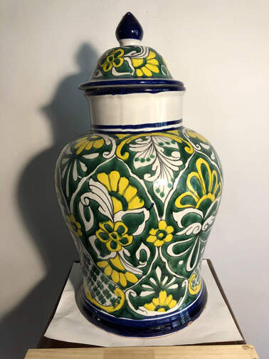 ![]() #426 - Canister with top, colored blue/green/yellow, 18" high 10" diam 2 pictures |