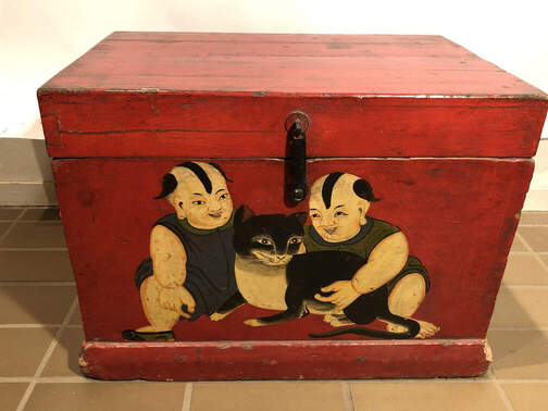 #478 - Wooden chest, 21"x14"x16", Japanese Antique, painted red with 2 children and cat, metal latch 4 pictures |