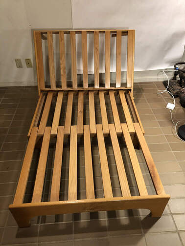 #482 - Twin bed frame, wooden, Can be reconfigured to be a chaise lounge or chair. 6 pictures |