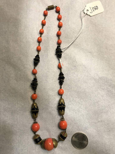 #J150 - Necklace, coral beads and black, with brass fittings |