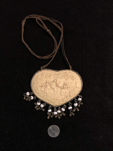 #J55 - Necklace, heart-shaped cameo, silver back, beads at bottom |