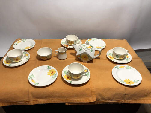 #481 - Children's Tea Set. 4 place settings, 1930s Art Deco Hancock's Ivory Ware, hand painted, The cups are 2.5 inches in diameter, 1 5/8 inches high. 5 pictures |