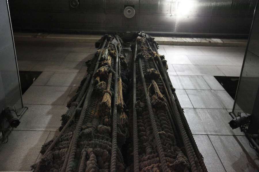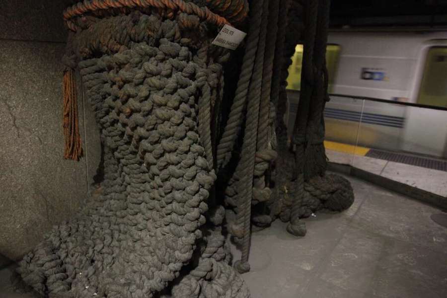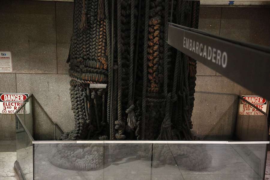 "Legs" hangs through all three levels of the station, and is made of Nomex, a fireproof material. When it was installed, it was a rich orange and white, and it shimmied and swayed when trains sped in and out of the Transbay Tube.