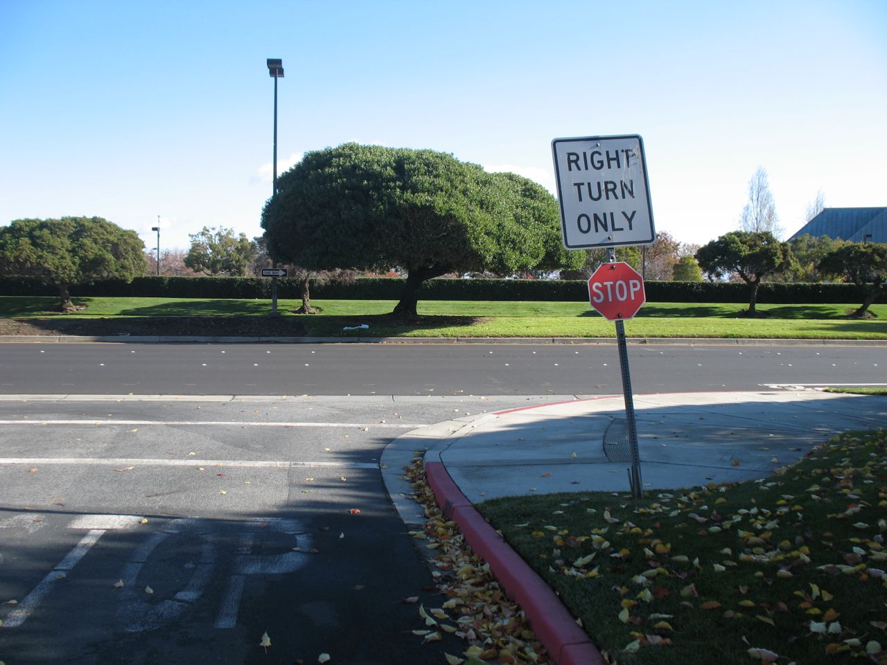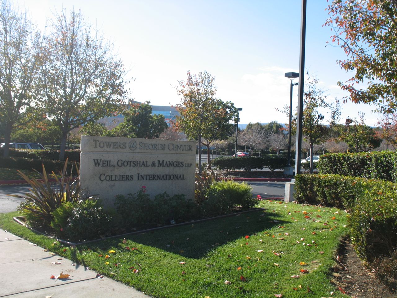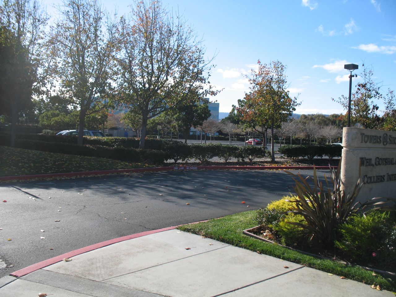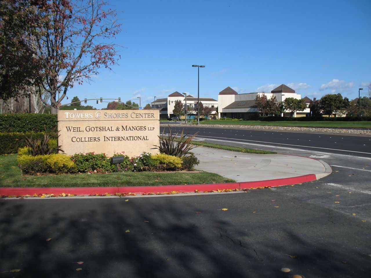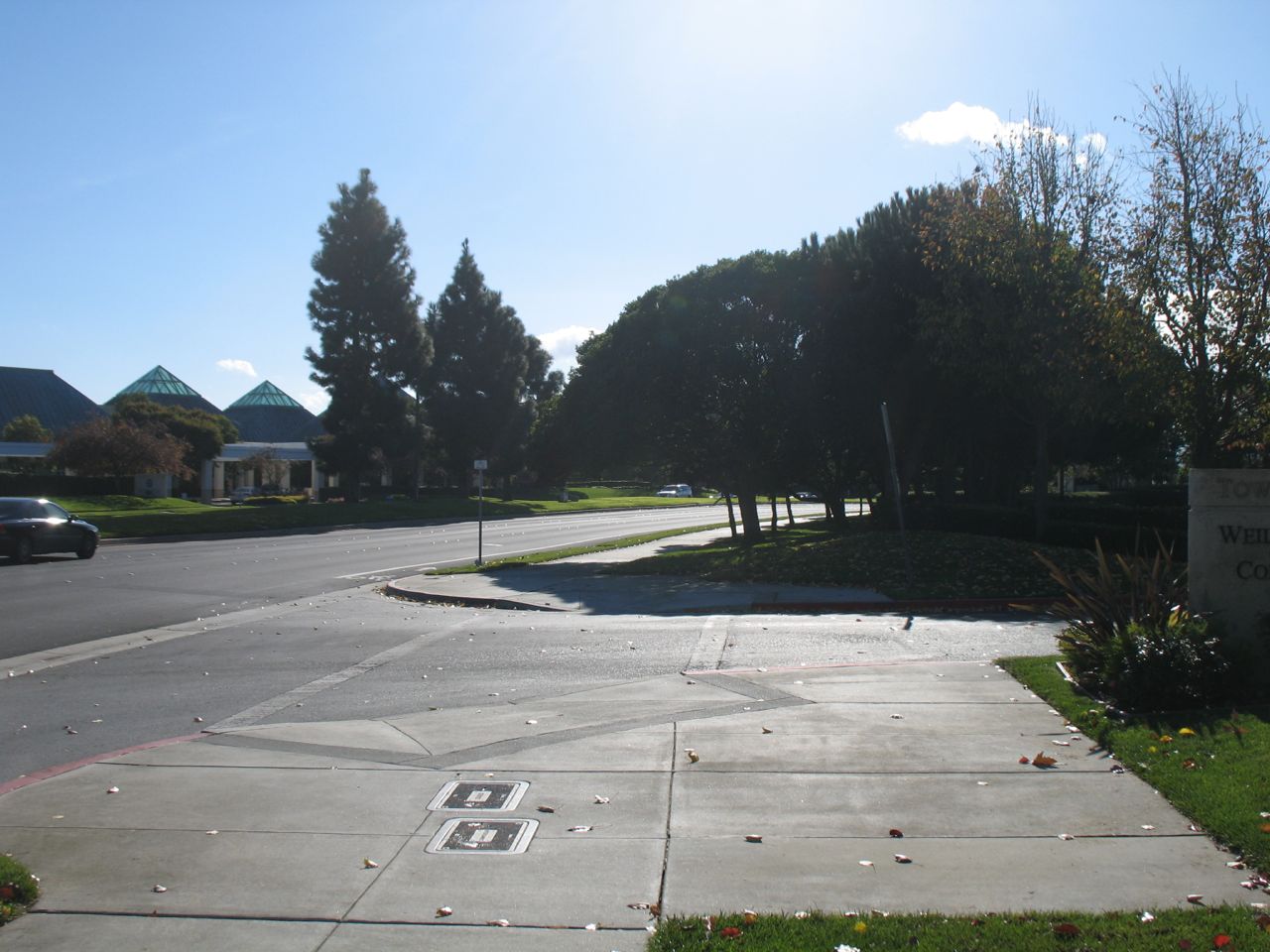 Note the "Towers @ Shores Center" sign that obscures the driver's view of whatever is coming down the sidewalk or the road.