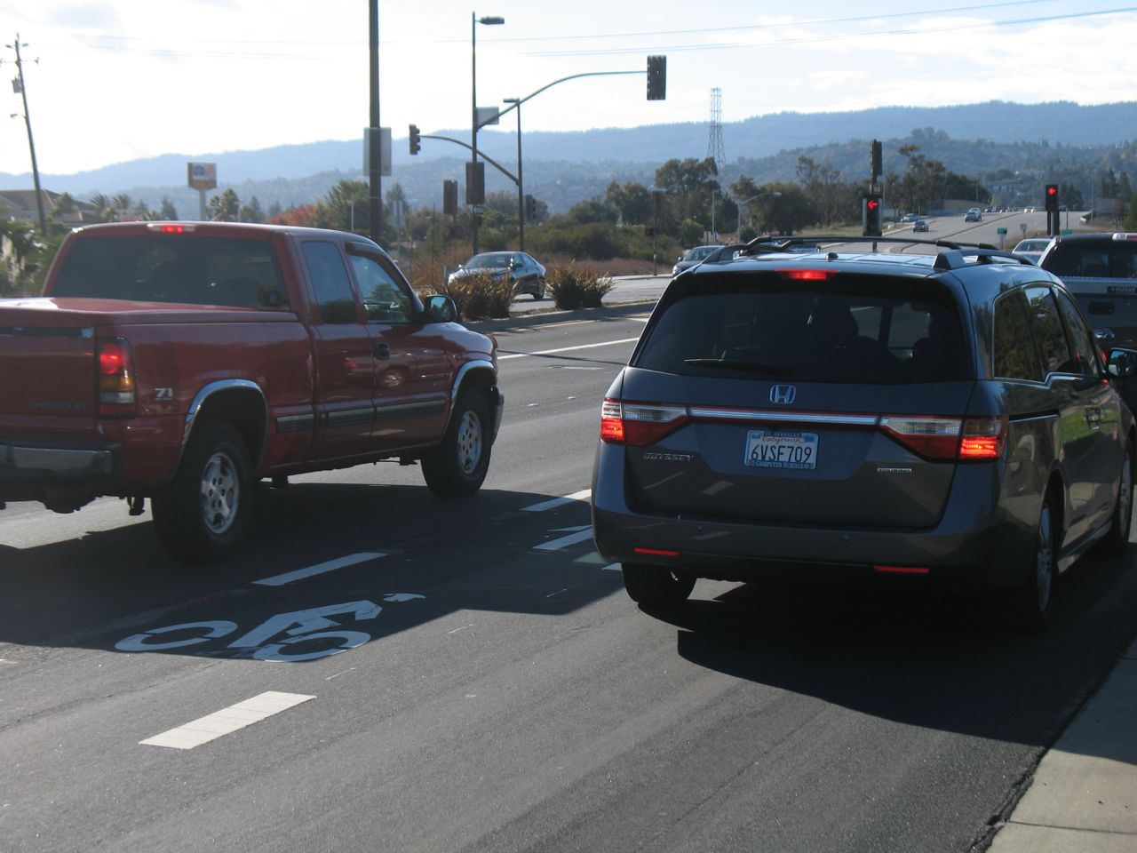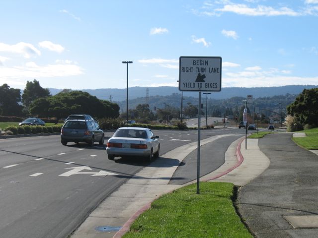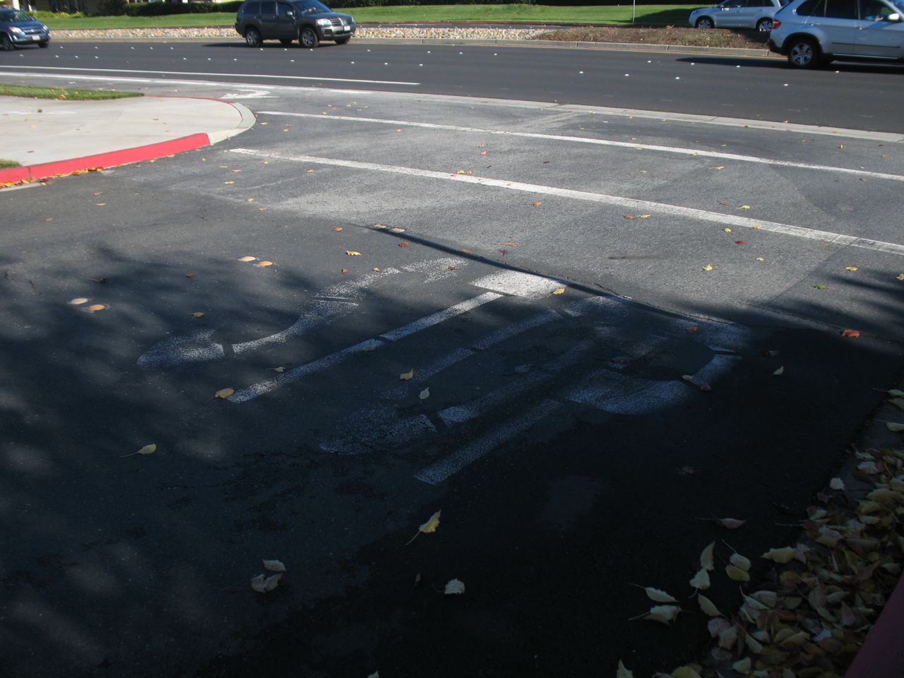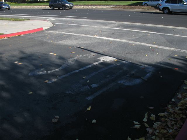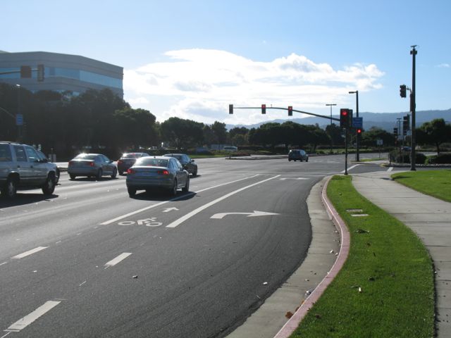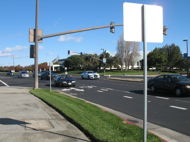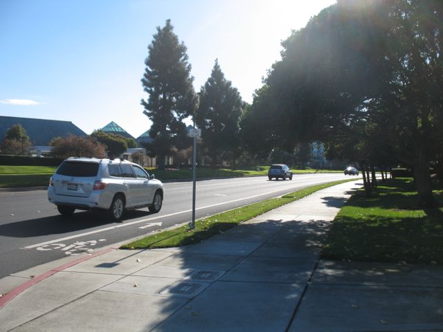 Approaching the crosswalk. Note that I could not yet have gotten on the bike lane at the right edge of Redwood Shores Parkway.