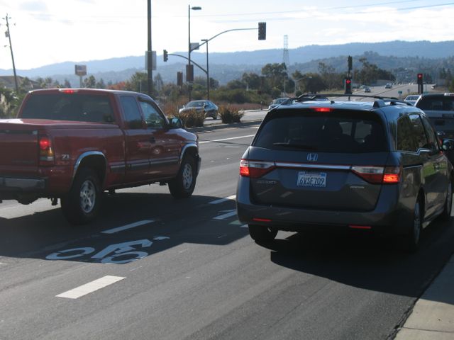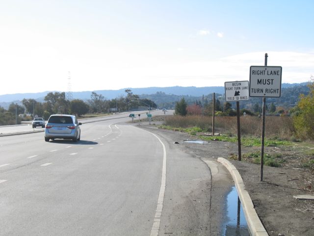 Here there are two lanes to the right and two lanes to the left of the bike lane. Not a safe place to be. It is much much safer for a bicyclist to ride down the sidewalk, use crosswalk to move over to the other side of the road, and ride on the sidewalk over 101 on the left hand side of the road.