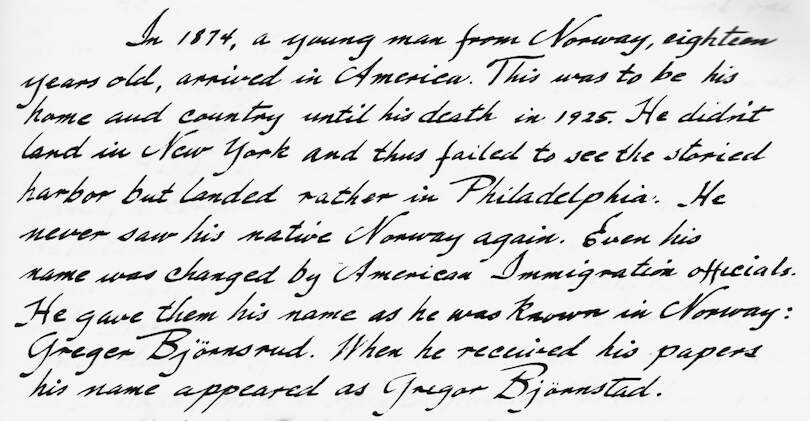 In 1874, a young man from Norway, eighteen years old, arrived in America. This was to be his home and country until his death in 1925. He didn't land in New York and thus failed to see the storied harbor but landed rather in Philadelphia. He never saw his native Norway again. Even his name was changed by American Immigration officials. He gave them his name as he was known in Norway: Greger Bjørnsrud. When he received his papers his name appeared as Gregor Bjornstad.