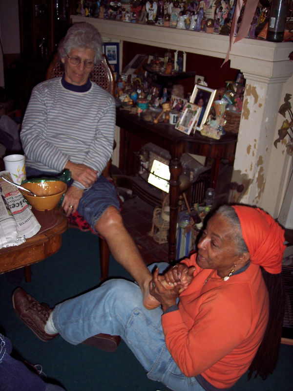 Bicycling back, Shyama has a bad fall, nothing broken, but bruised and hurt. Here Mama D massages her foot and knee sitting on the floor talking gently with Shyama for an hour.