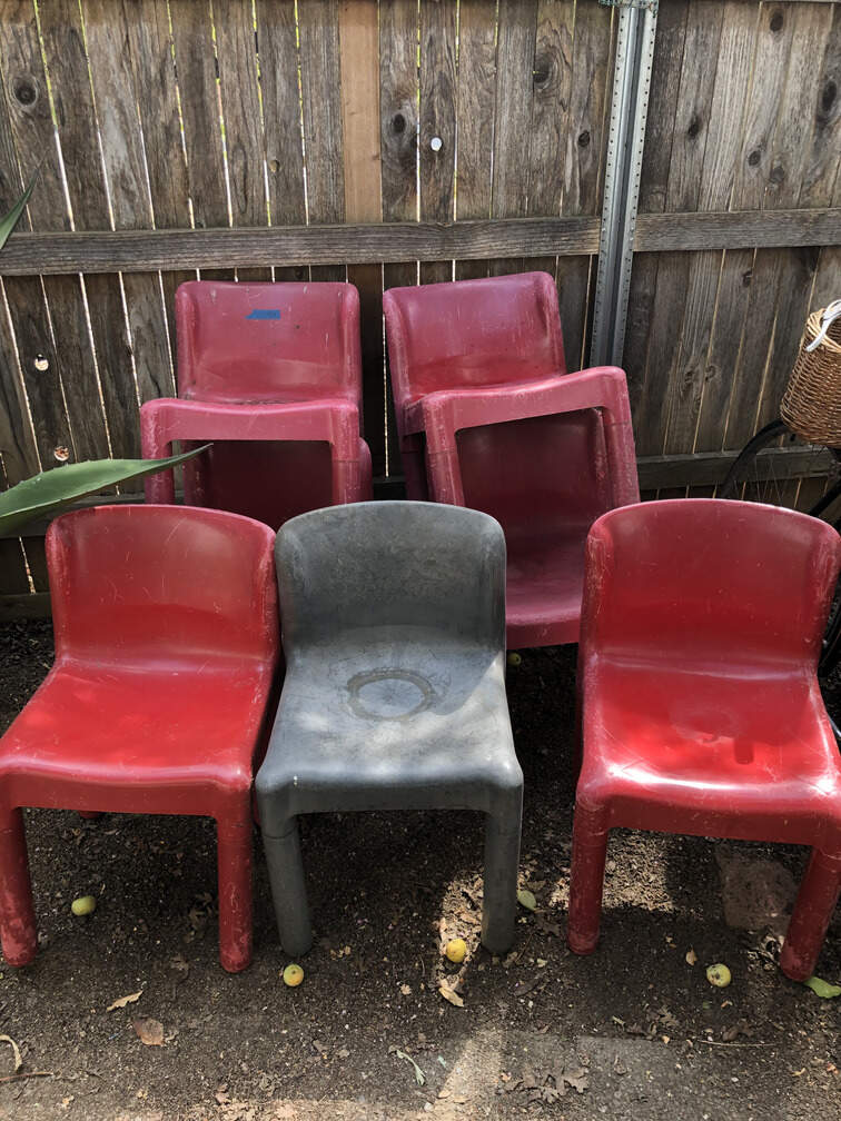 #142 - Chairs, seven plastic, six red, one gray