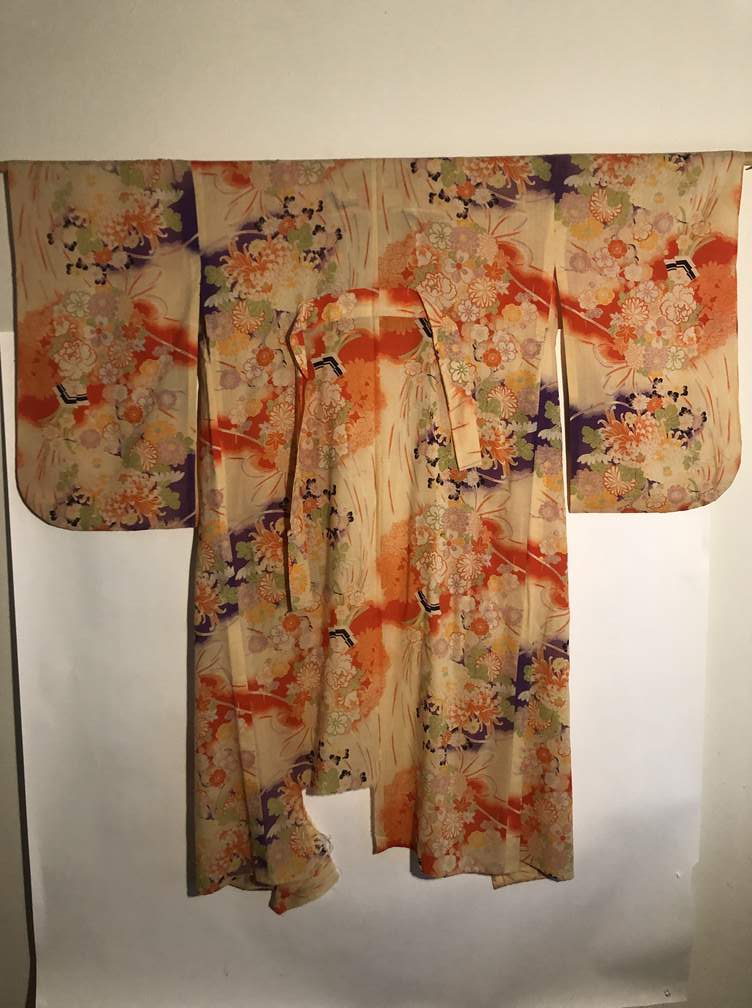 #C12 - Kimono, bright pink and reds, large tear on bottom