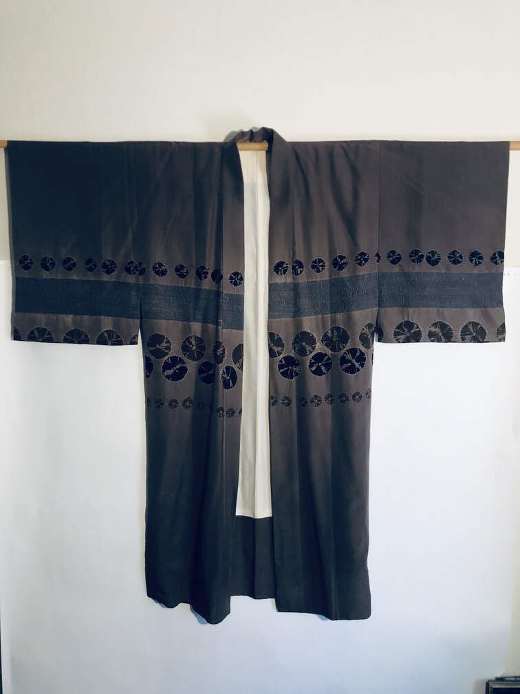 #C28 - Kimono, silk, brown w/ black trim, white lining