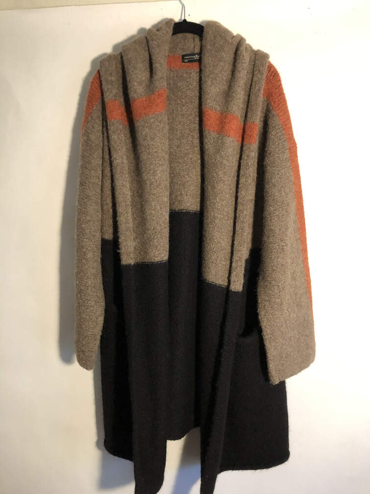 #C58 - Sweater coat with hood, tan/black/rust