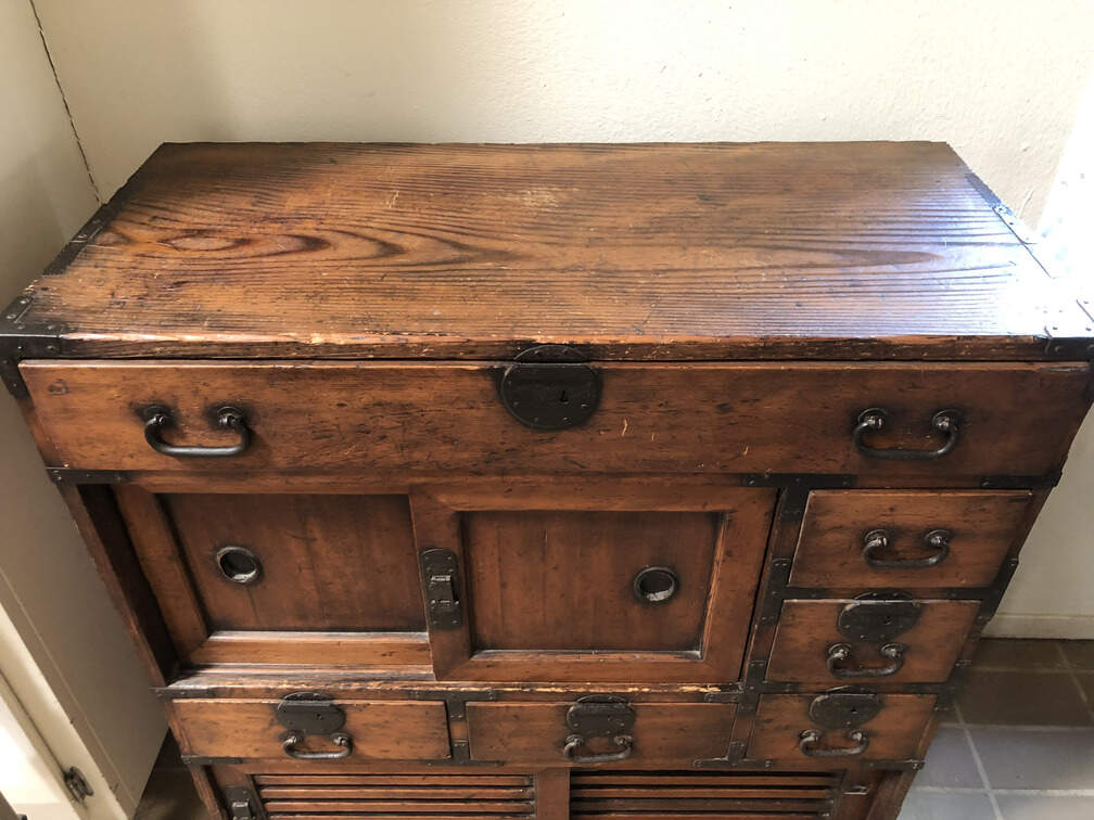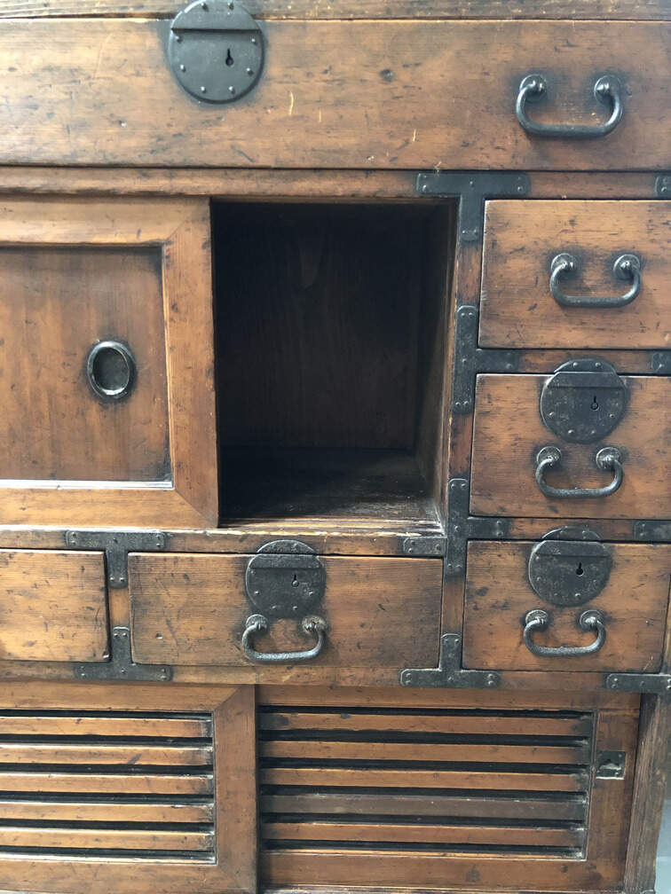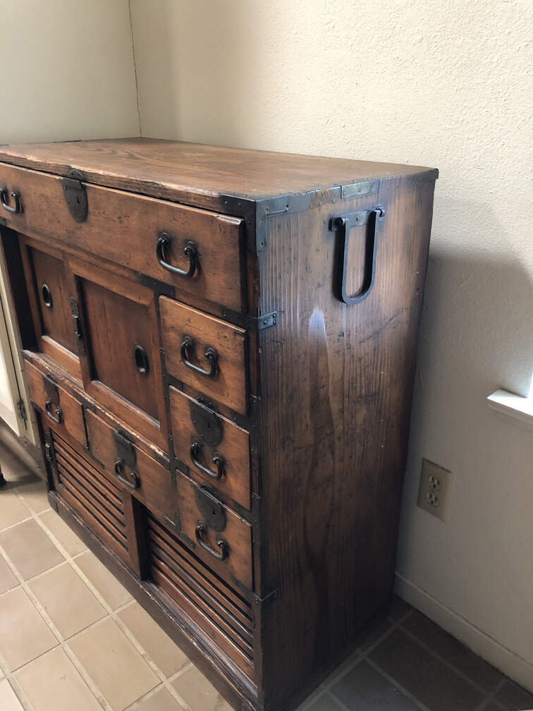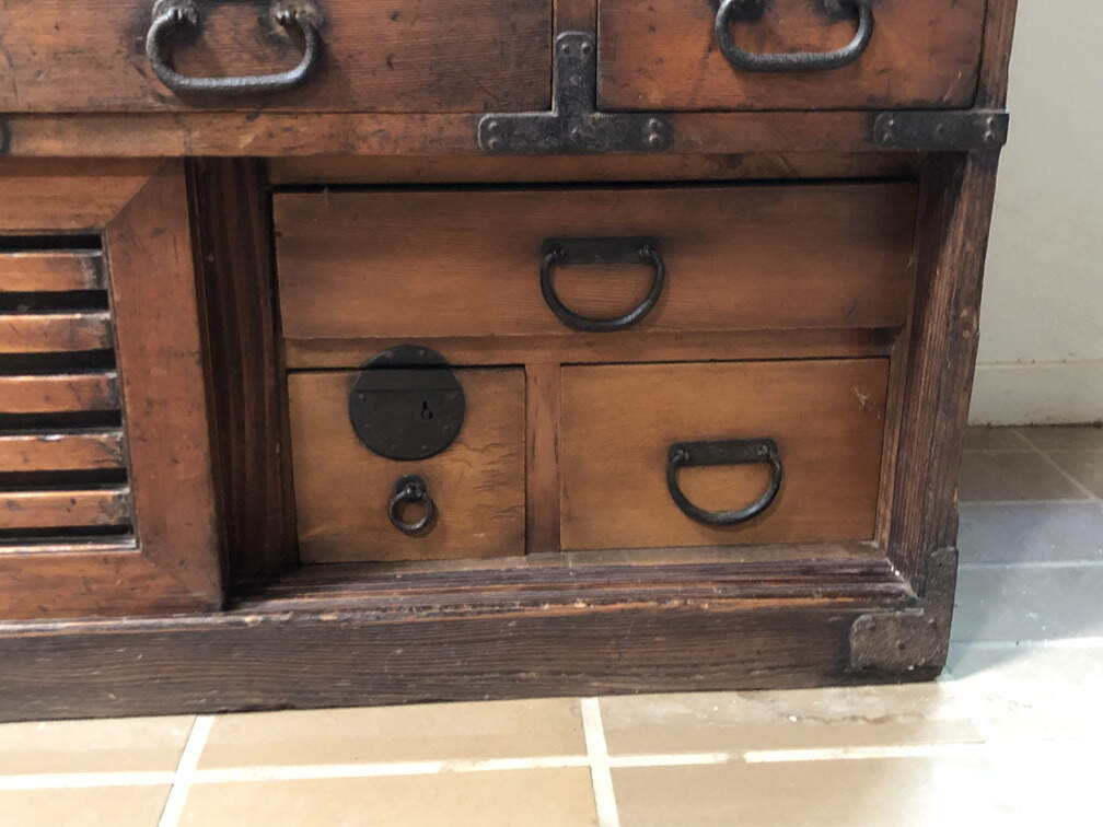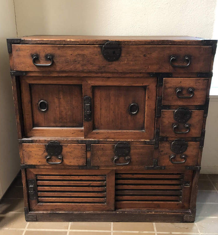 #F2 - Chest of Many Drawers, stained pine, 9 drawers, 2 cabinets behind sliding doors, 34"x15"x36"