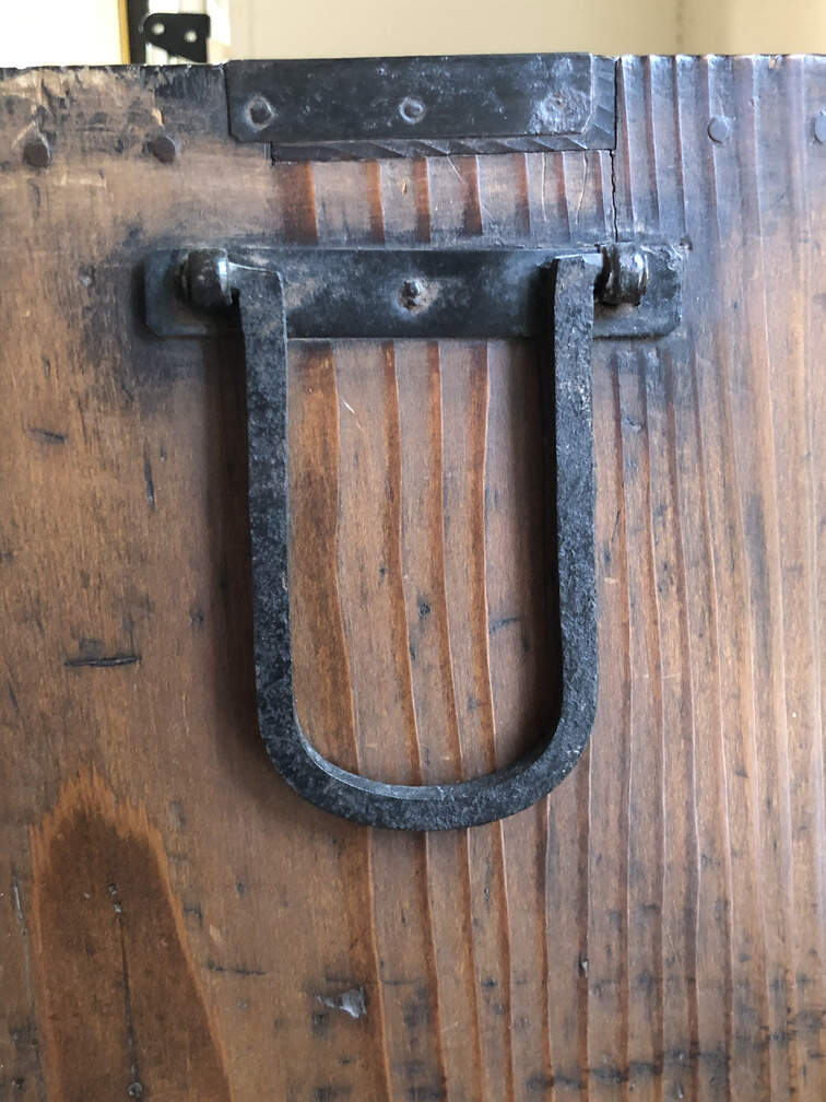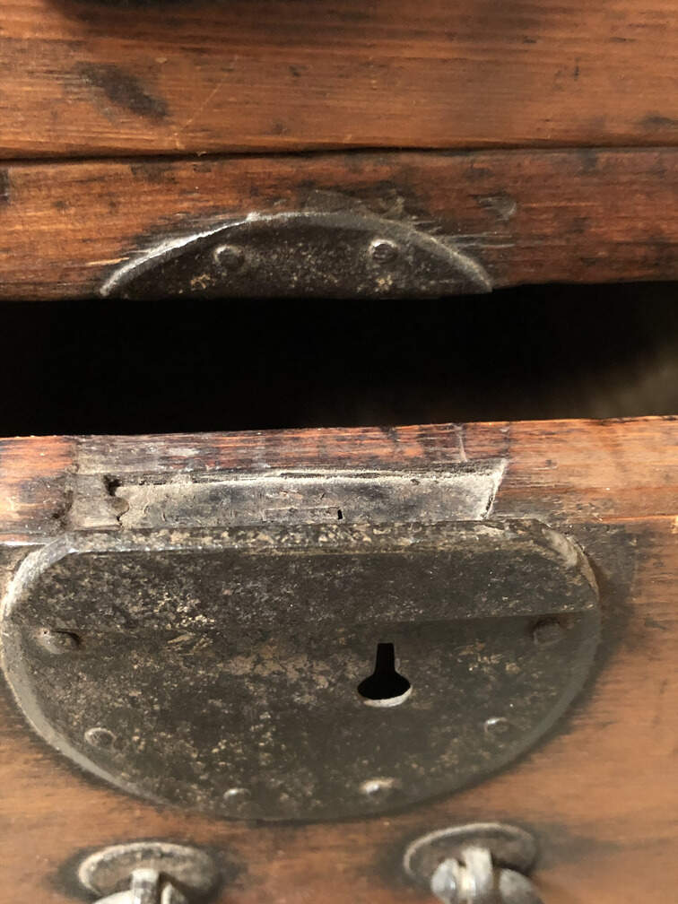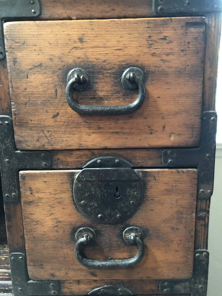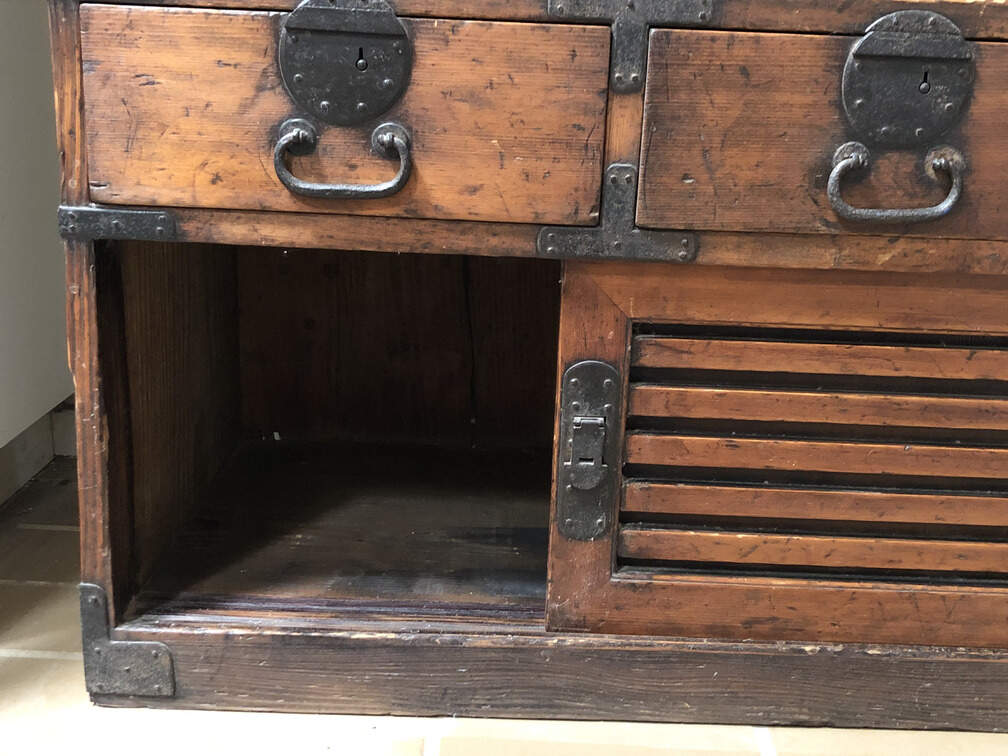 #F2 - Chest of Many Drawers, stained pine, 9 drawers, 2 cabinets behind sliding doors, 34"x15"x36"