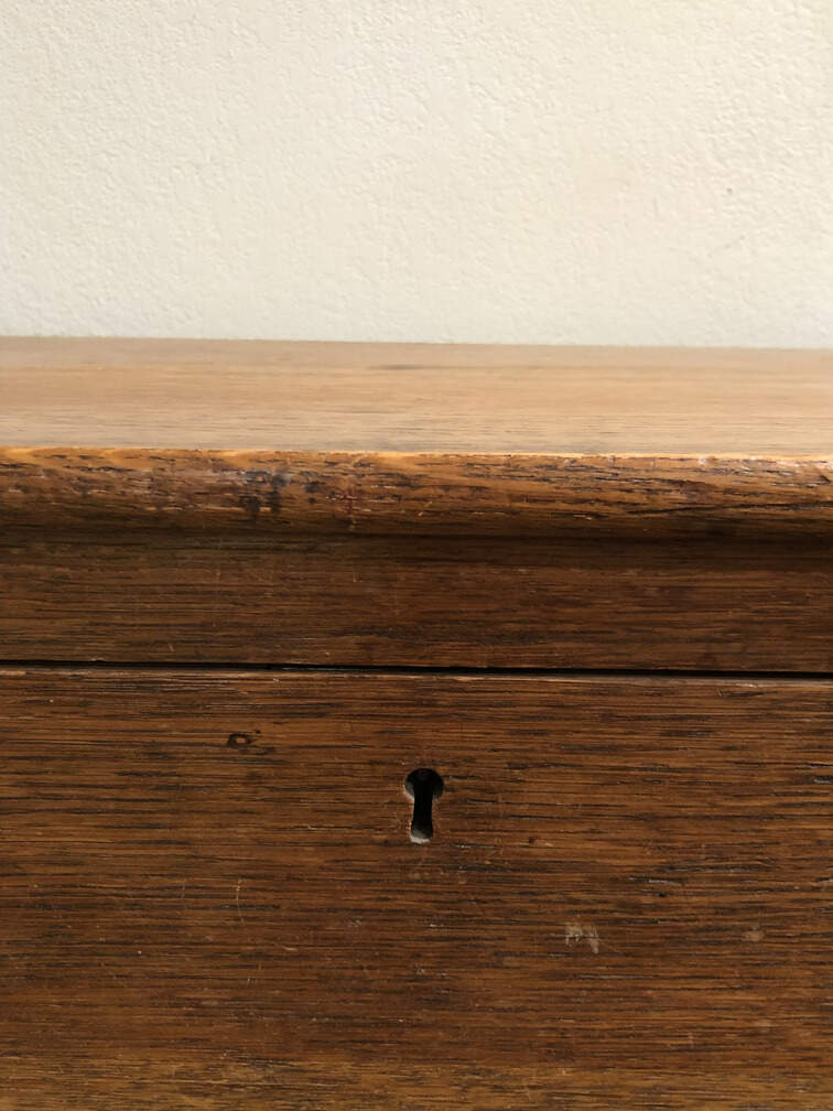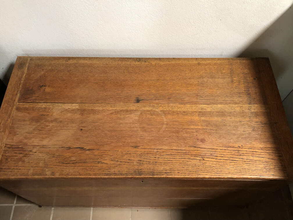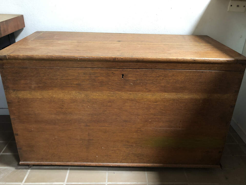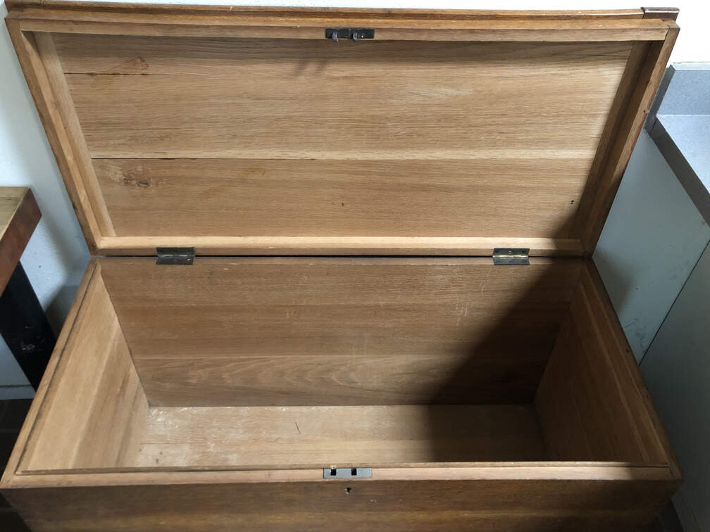 #F6 - Large Wooden Chest, oak, open space, on small wheels, 20.5"x42.5"x26", with key to lock it