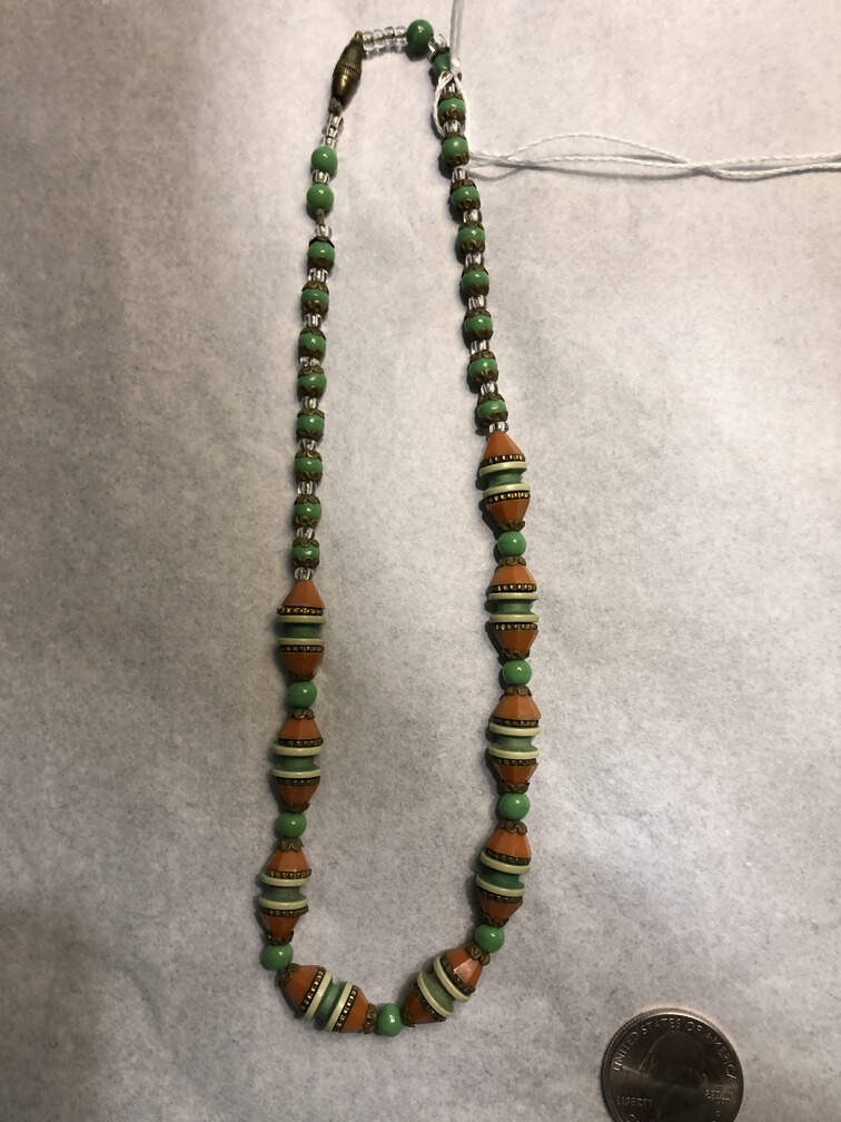 #J151 - Necklace, turquoise, red/green and brass
