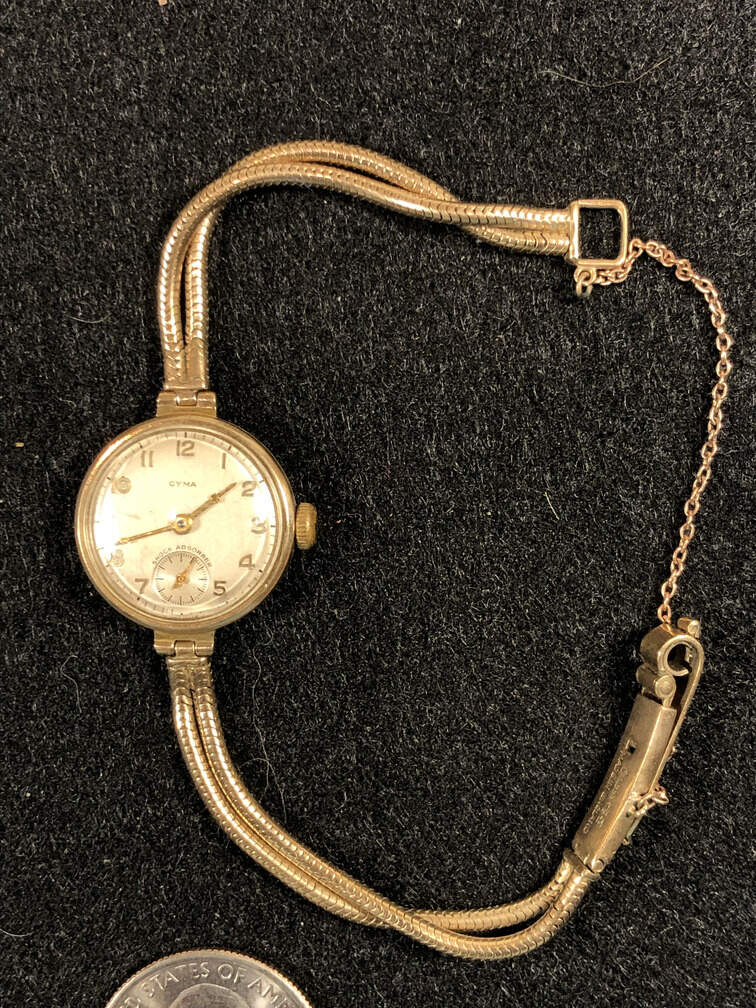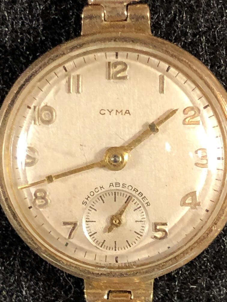 #J154 - Watch, women's, gold tone, CYMA, engraved M.J.