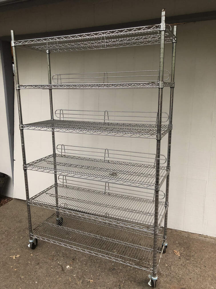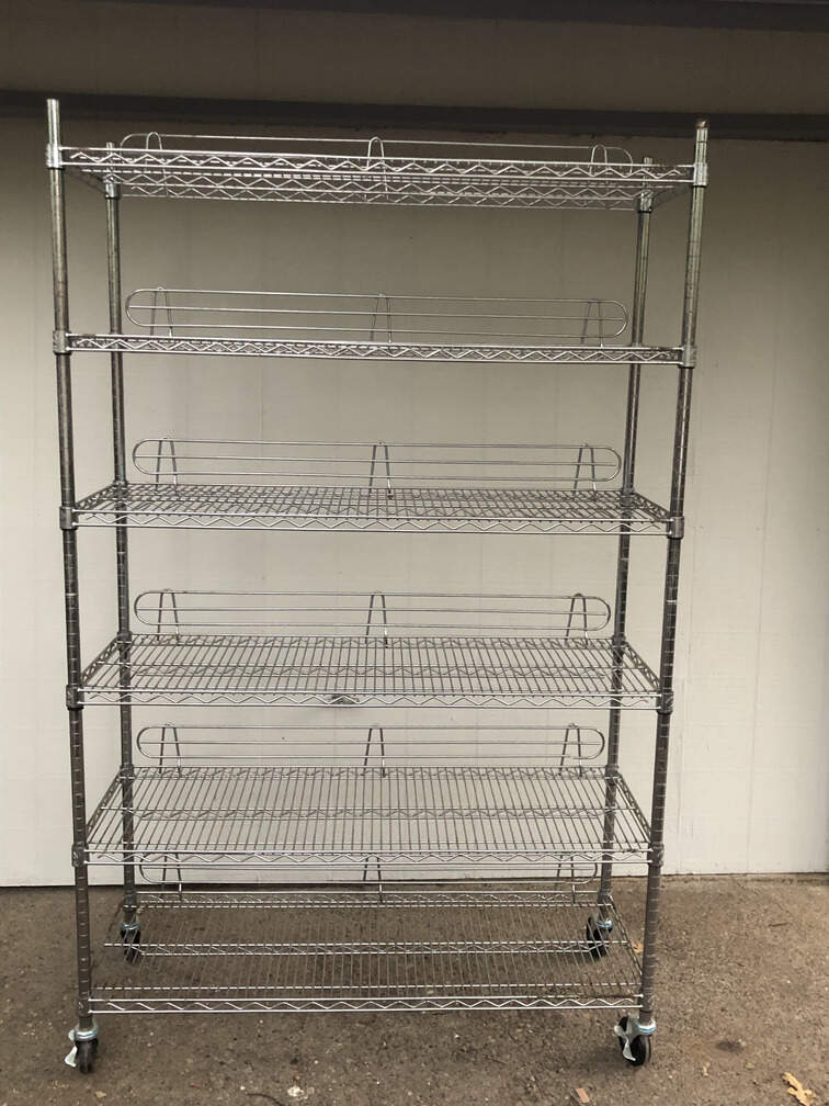 #Y96 - Shelves, steel, two of them, 6 platforms, with wheels, 47"x18"x77" -