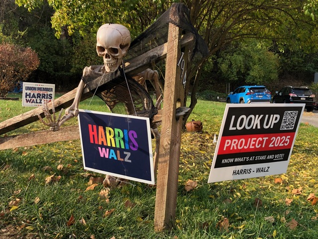 The confluence of Halloween and the Election has me bewildered, bewitched, and befuddled. Pumpkins and political signs are weirdly juxtaposed. Perhaps writing this report will calm me down. I’ll share several pictures and relate some conversations I’ve had while canvassing.