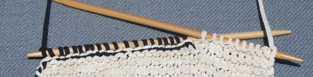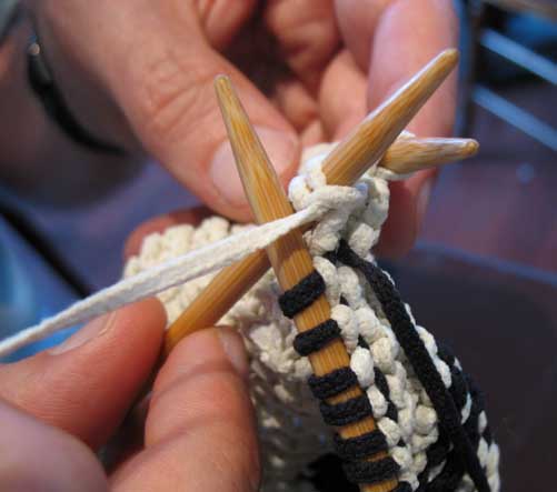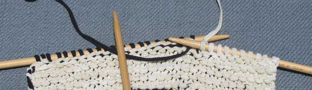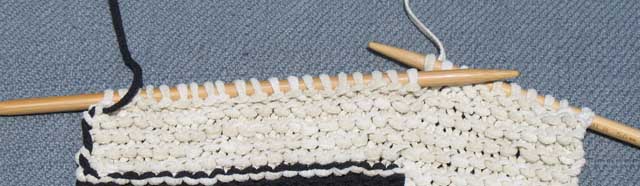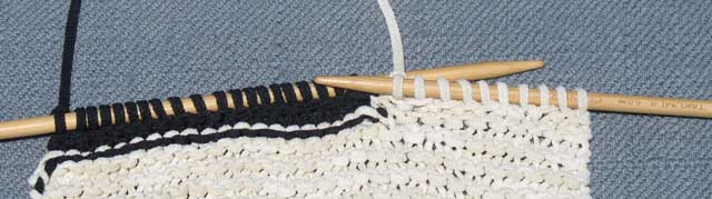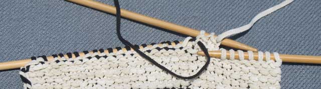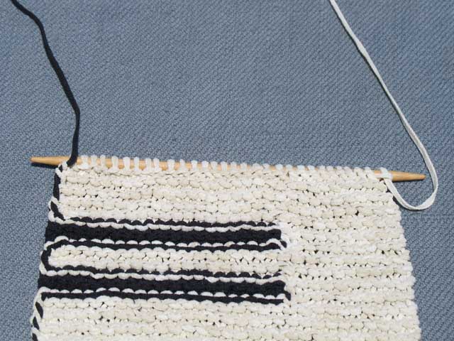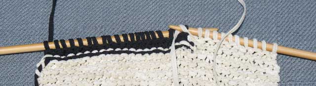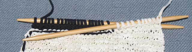 Whenever you are at the black edge with the white yarn be sure to cross the white under the black before proceeding back to the white edge. This way the black yarn will be carried along the edge and will be ready when it is next needed. This does make for “crossings”, but, since they are on the edge, it is visually more acceptable.