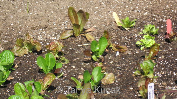 Newly planted, the heirloom lettuces have interesting colors and patterns: light green, medium green, spotted and speckled, and red-tinged.