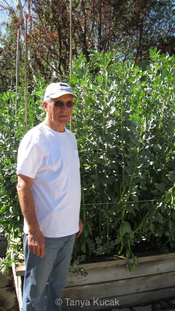 Ron Labetich stands in front of his winter cover crop, fava beans, in his sunny backyard garden. He used wood from a deck to build the tall raised beds.