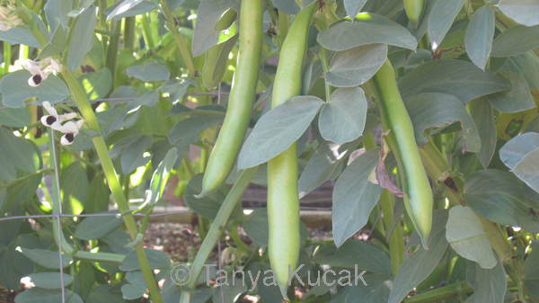 Fava beans, at right, are one type of bean that will grow in the winter. Planted in the fall, they protect the soil through the winter and can be turned into the soil to add some nitrogen in early spring. At left, notice fava's beautiful black and white flowers.