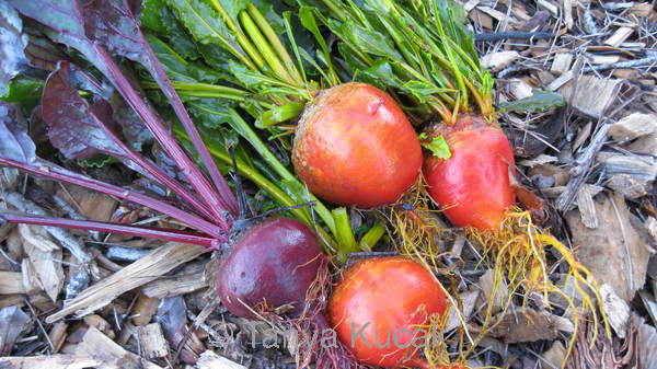 Golden beets are as pretty, tasty, and productive as red beets, but they don't spread their color to other foods. Though orange-tinted on the outside, golden beets are deep yellow inside.