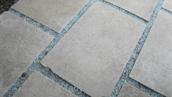 To keep rainwater on site, use pavers instead of unbroken expanses of concrete. This path uses pieces of a former sidewalk as pavers, with tumbled glass in-between as a creative touch.