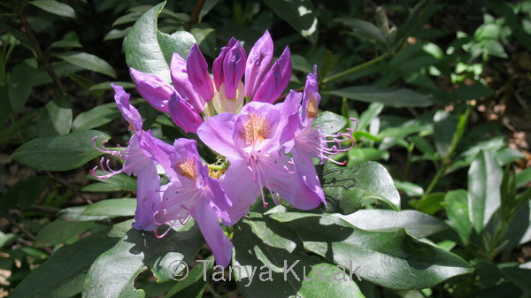 California rose-bay, a native evergreen rhododendron, grows in the dappled shade between redwood trees.