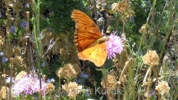 A Gulf Fritillary butterfly sips nectar from a native coyote mint flower. Gulf Fritillaries are common in the Bay Area, though they are not natives. They lay their eggs on passion flower vines.
