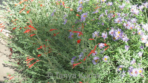 Hummingbird fuchsia and California aster bloom from midsummer until frost in this garden. The orange-red tubular flowers attract hummingbirds, and the tiny disk flowers of the aster draw beneficial insects.
