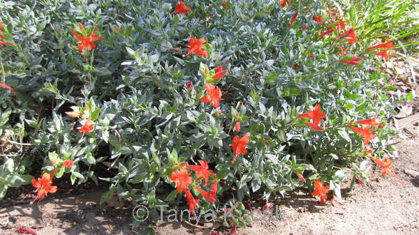The most widely planted of the autumn stunners is hummingbird fuchsia. It comes in several varieties, most of have flowers in the red-orange palette and foliage that ranges from gray-green to blue-green to silvery gray. You can also find white and pale pink flowers. Some varieties can be 3 feet tall and a little floppy; others grow only a foot or two. Select Mattole is the lowest-growing variety, with foliage and flowers less wispy looking than the other species, and it forms a neater clump.