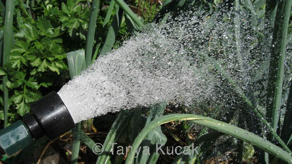 Do use a Dramm water breaker with a gentle flow. Don't water too high like this, losing water to evaporation. Instead, direct the flow of water downward and water near the roots of plants. Protect tomatoes, squash, and cucumbers from waterborne diseases by keeping the leaves dry.
