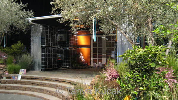 The “no city water” display garden created by Clearwater Designs at the San Francisco Flower and Garden Show featured 8 large rainwater-storage tanks, used as patio walls, and a cistern below the patio. Altogether, the water storage capacity was 6740 gallons.
