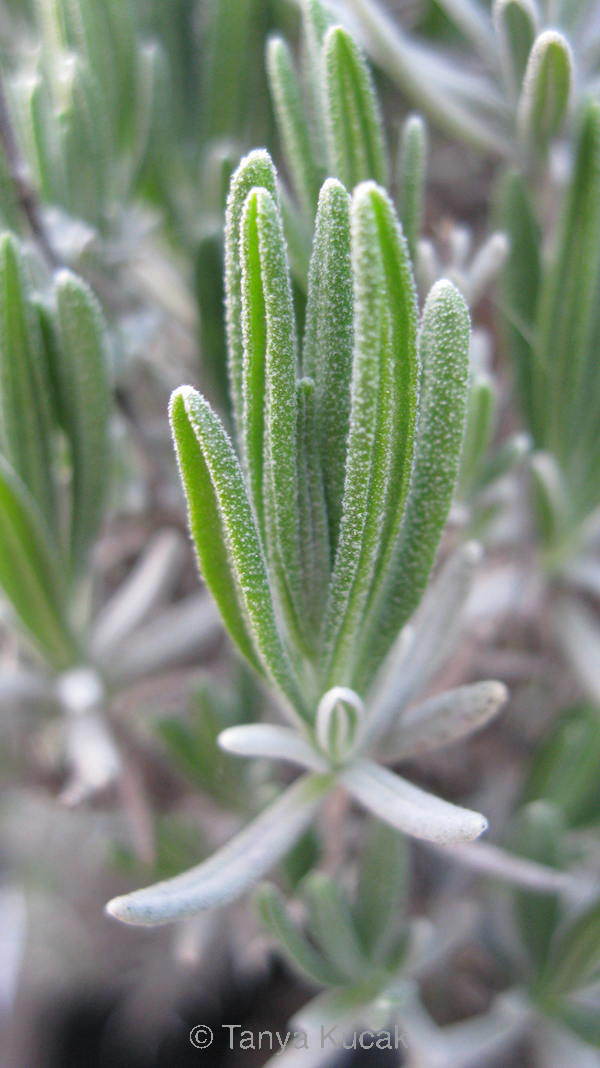 On a multibranched shrub such as lavender, it's easy to identify the actively growing branch tips that will be rich in auxins. On this variety, they have soft green leaves, which will turn more silvery as the season progresses.