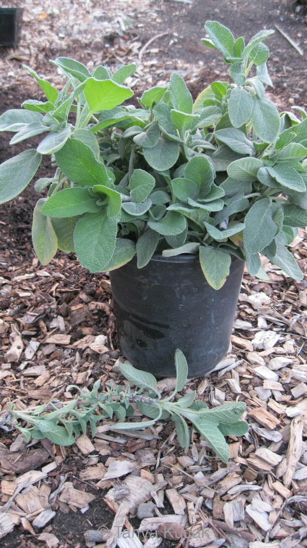 When you take cuttings, place them vertically so that the auxins, which stimulate root growth, will accumulate in the bottom of the cutting. Don't lay the cuttings on your work surface, like the example in the foreground. Instead, place them in a container where they can stand upright, like these sage cuttings.