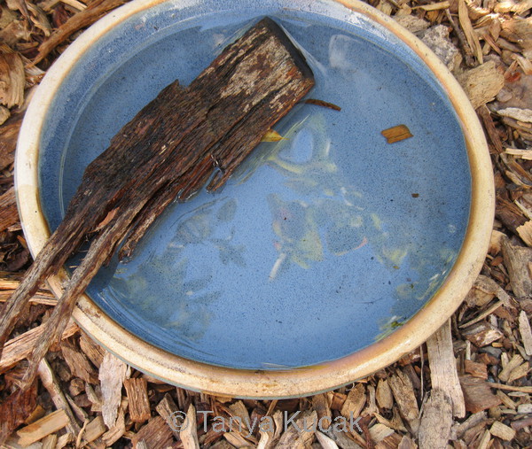 Bees and butterflies need shallow water, such as a saucer with sand and pebbles, or else a way to climb out of the water. They can easily drown in a container that is too deep or that has slick sides. Placing a large piece of mulch in this saucer enables critters to climb out of the water easily.