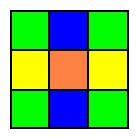 This subgroup is large enough to be challenging to the beginning cubologist but not too big to be overwhelming. It consists of all processes generated by the moves X = (RL-1), Y= (UD-1) and Z = (FB-1). This group gets its name from the fact that each of the allowed moves is equivalent to a move of a middle "slice." In the slice group the patterns on each face exhibit a certain symmetry. The corner facelets of each face are always the same color. Also, opposite edge facelets of each face are the same color. This gives a pattern similar to this: