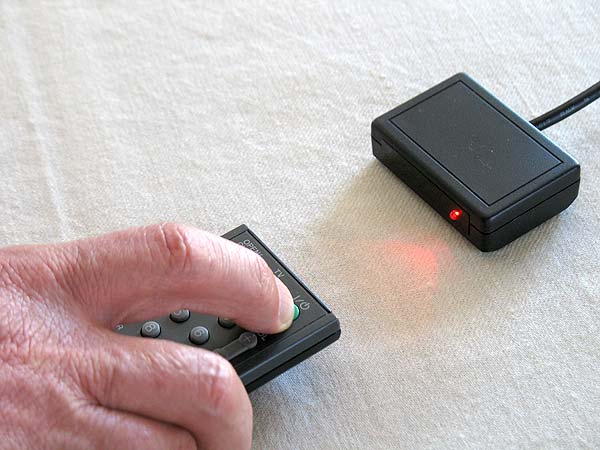 For purposes of demonstration we will teach the USB-UIRT how to turn the power on and off. Press the Power button and hold it for a second or two. The red light on the USB-UIRT will glow indicating that is receiving the signal.
