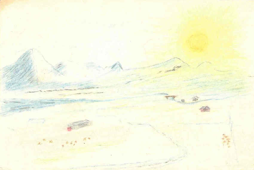 I sat down. They went into kitchen. Little while passed by myself. Then Arni came. I asked to go út hús. We came into kitchen. Father had book about Icelanders settling America. I looked through. Remarked about English intro, map of N.D., Bottineau, men with long beards. Father looked up Freemans, found reference to Guðmundur. I copied down title, author, publisher. We went out. He showed me around. I asked to go various places - inside place where kind were kept. I looked up various words - name (of dog - Lappi), soft, warm (of wool), white, brown. He showed me 1953 Willy Jeep his father was working on. I decided to draw landscapes (see above). Motioned - said tíu minute. Said - you - in hús - went to urinate, coffee! several times, warm hands, showed Mom drawing.