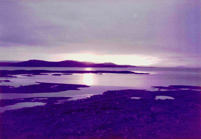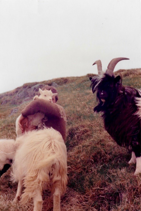 Bus stopped ~12:00. man, young man son got out of Volvo. I got off. Shook hands with the man, said Jón, son said Arni. They spoke with bus driver shortly. Something about 4:00 16:00. Saying nothing we loaded my bag into trunk, took off. Drove for 5-10 minutes in silence. Got to house. Motioned to not take bag in. Took shoes off. Came in, met mother, other son. All was silence. They felt a little uneasy. I began to look around living room. It was like any middle class living room in U.S. Pictures on wall of handiwork. Done by mother probably. TV, pump organ. Radio was on (or turned on later because of silence?) I look around, out window. Motioned that it was beautiful, said “beautiful”. Mother, son were there. Sat in chair. Took out camera, drawing set. Son went to get his pictures, camera (a good one), map. Kind, Gate (Geit). I asked, took one of geit.