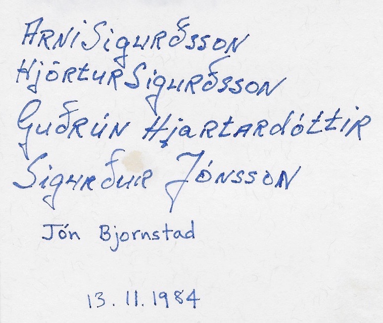 The mother, Guðrún, served a meal of mutton chops (kind), potatoes (kartofla), beets, some sweet stuff like jelly, and coca-cola to drink and ice cream and fruit cocktail for dessert. Einar Siggeirson had apparently not told them I was vegetarian. There was no way for me to explain, they would not have understood even if I could speak Icelandic. Enjoying the meal was my main way of showing that I cared. So I said a little prayer and had some kind. It was okay. Hard to cut, chew, a little stringy, not exactly tasty. It brought back memories of my youth. I enjoyed it as much as I could. Coffee with molis [sugar cubes] before and after the meal and then again later with pönnakakas [[pancakes]]. Coffee, Coffee, Coffee.