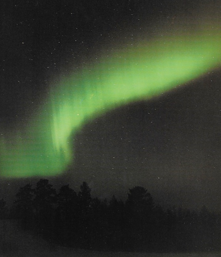 ... it was so clear I hoped for northern lights. Meal of potatoes, cheese, carrots, hazelnuts. Wrote postcards. Boy and girl came - took shower. I left them alone. Except to follow. Bought some food. At stores now open? On the way back saw northern lights. Great. Watched a while. Was charmed by the Big Dipper being underneath them. No moon. They kept getting better. I went in, put food away. Better clothes. Came back. Watched for 10 minutes, sore neck. They stretched all the way across the sky. Went to get bench to lay on. Better. Different bands - 9 in all. Fantastic, stupendous - as was said in Let's Go Europe. Sometimes transparent, sometimes intense white. Usually a great circle, sometimes perpendicular. So good. Moving, reforming, awe inspiring. Electric speed motion, like wind blowing a cloud apart. Enough. I came in. Little desire to see more. I had peaked. A peak experience. Anything else could only diminish the experience. Wrote postcards telling about it.