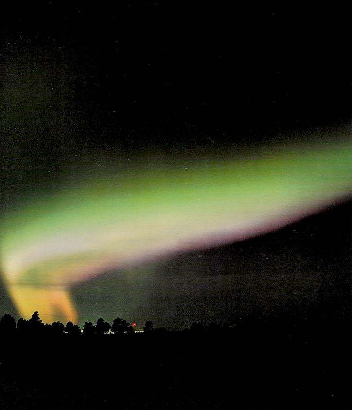 Later ~10:30 Roar came to say hello and left. He returned and called to me. Colors! Red, real green, moving in line | | | | | | | | | I was speechless. He left saying, “Now you've seen the real northern lights.” He said rarely are the colors so strong. 5 minutes later they came again. Not in line but swirling around in a spiral. Directly overhead was Orion.