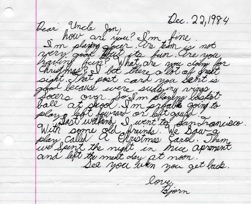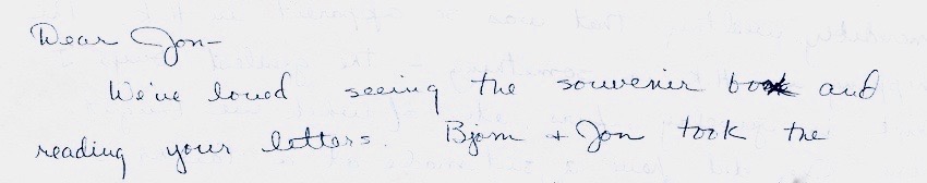 We've loved seeing the souvenir box and reading your letters. Bjorn & Jon took the comic book, a couple of the postcards, and the “Baby Bjorn” stuff home with them from mom & dad's. I can imagine that your times are wonderful - and it is amazing we are really all alike.