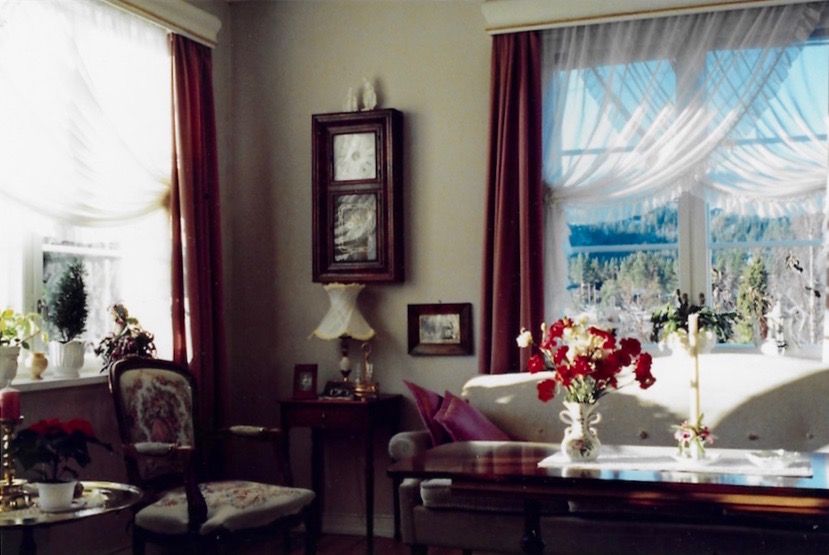 They like purple. Precious family furniture, drawings, and paintings by Rolf before the war. Tables, chairs, chest, mittens from Jøran's grandmother, great grandmother, and great great grandmother. Lovely china, silver, many many elegant serving dishes. They don't have a new car or a VCR or a microwave or a garbage disposal. Their refrigerator is small and the washer, dryer tiny and time-consuming to use. Heat from oil burning stoves in the center of the house, 2 wood stoves, several electric heaters. 2 floors, big cellar in the basement, garage, large storage building, big yard, flagpole.